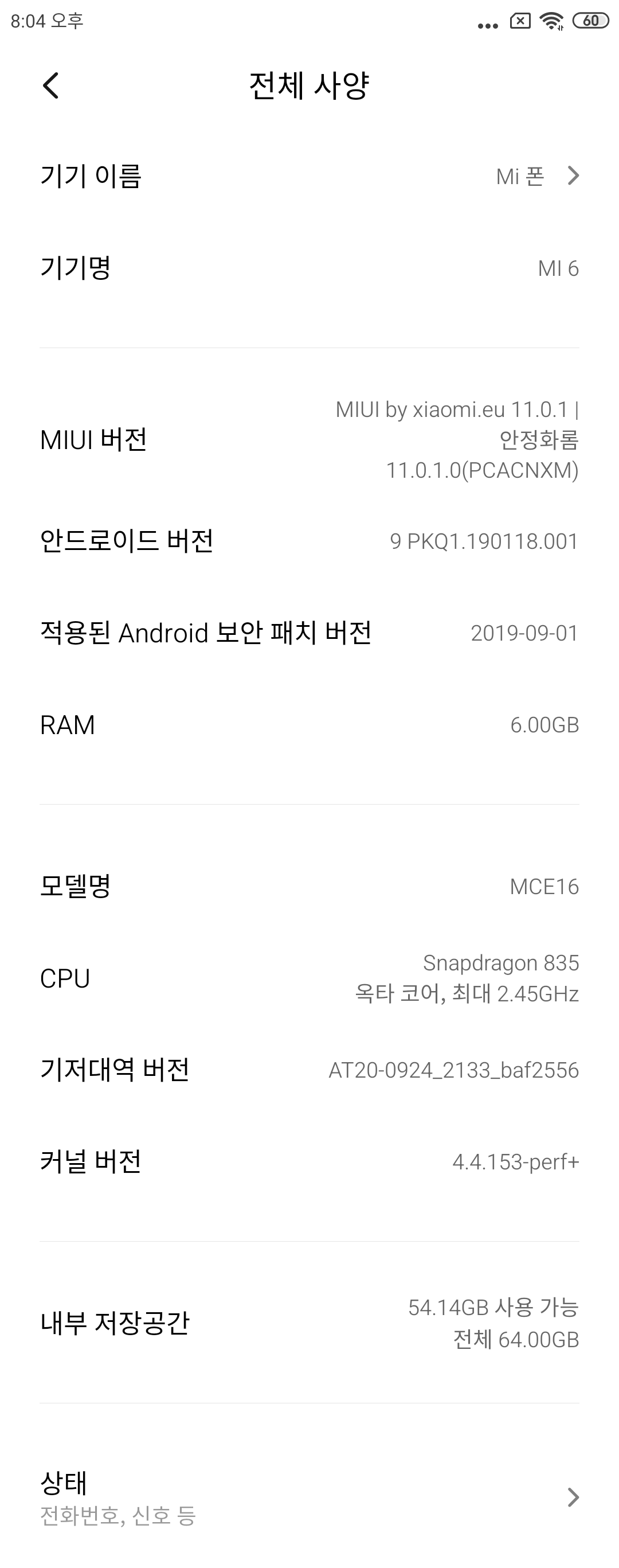 샤오미 미6 MIUI 11 EU롬 V11.0.1.0 안정