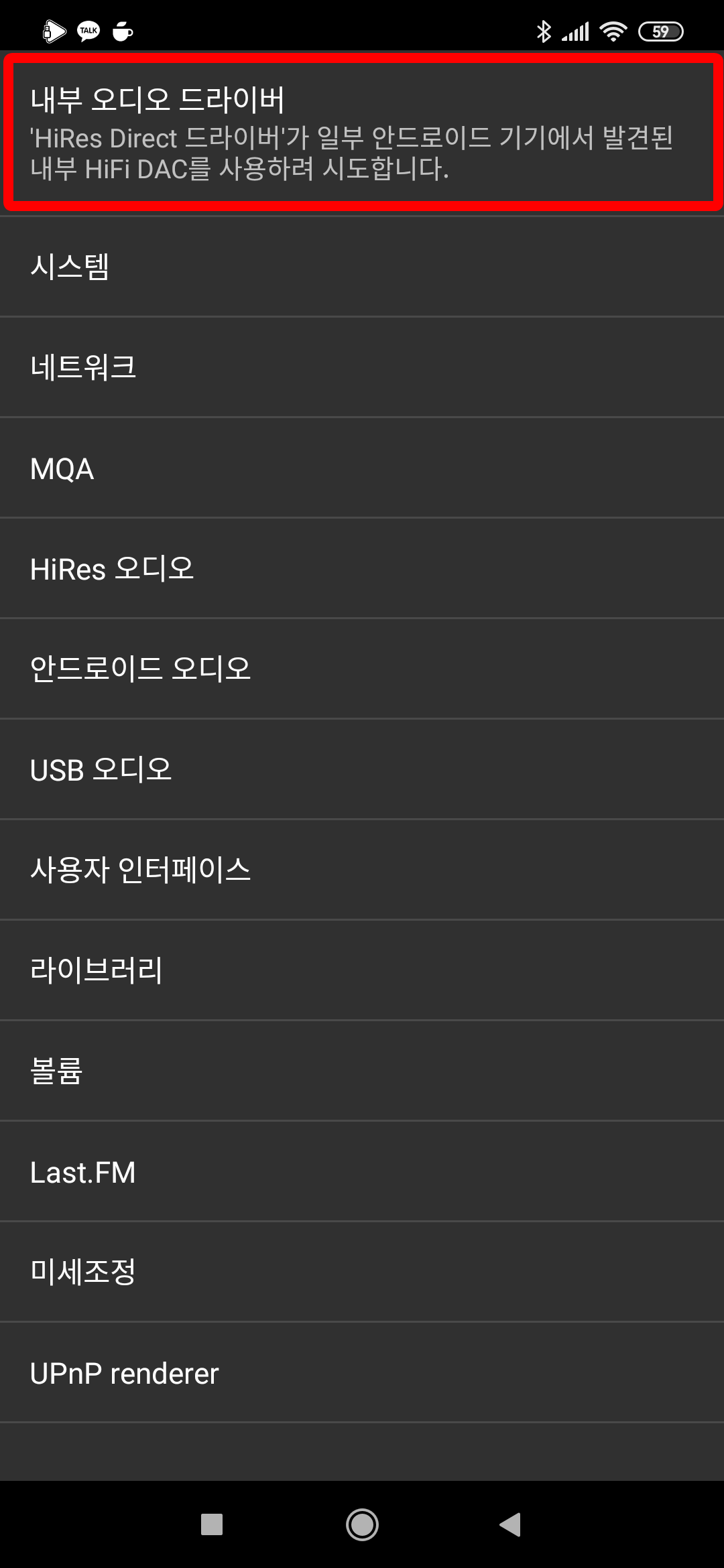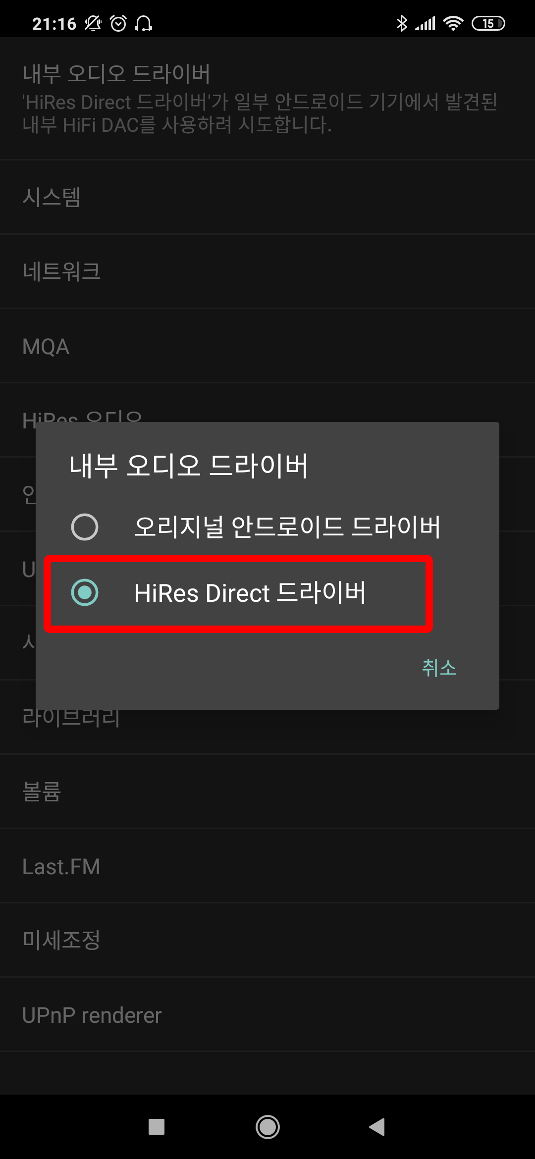 내부 오디오 드라이버 → HiRes Direct 드라이버
