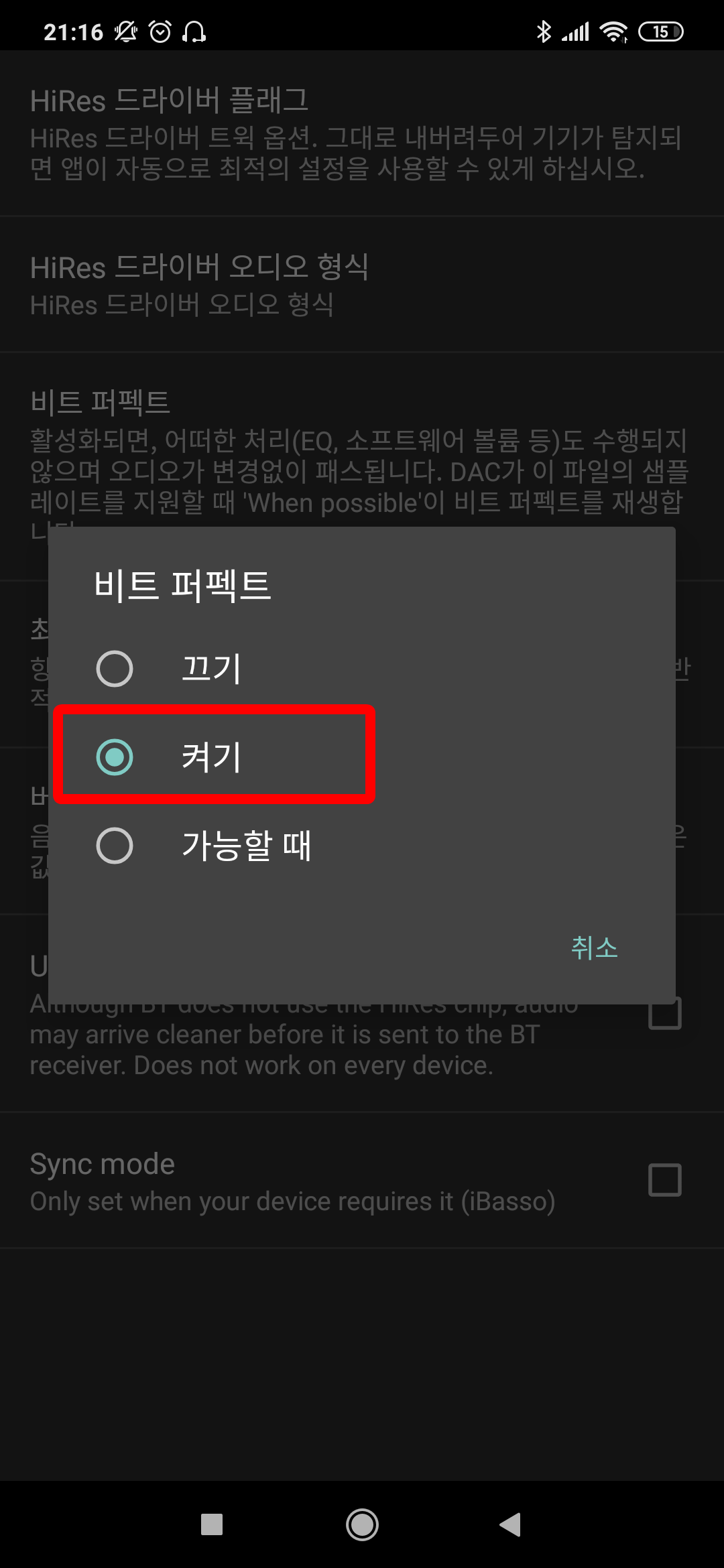 비트 퍼펙트 → 켜기