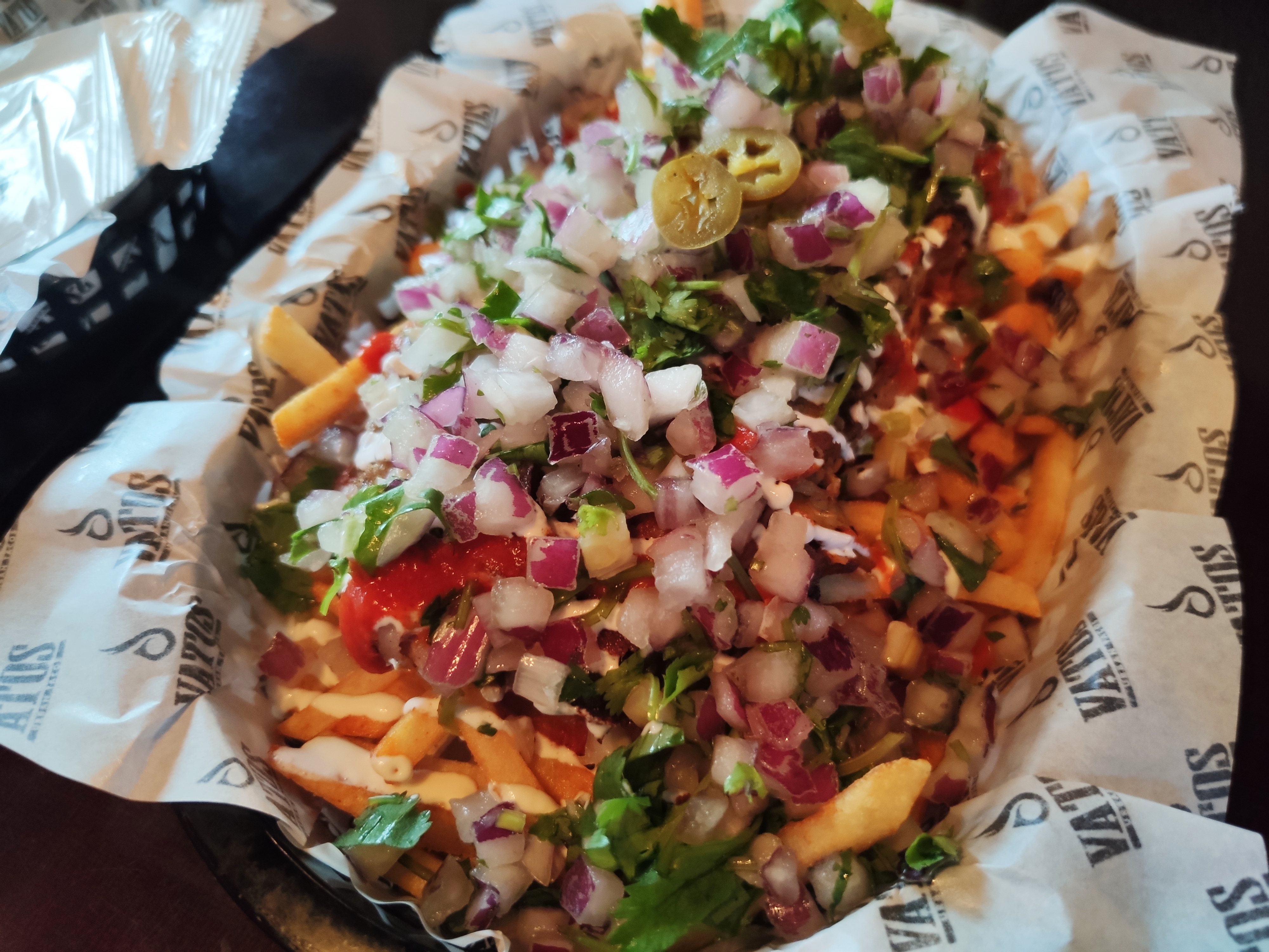 오븐구이 까르니따스(돼지고기), 볶음 김치, 양념한 감자튀김, 치즈, 양파, 고수, 샤워크림, 바토스 핫소스, 할라피뇨