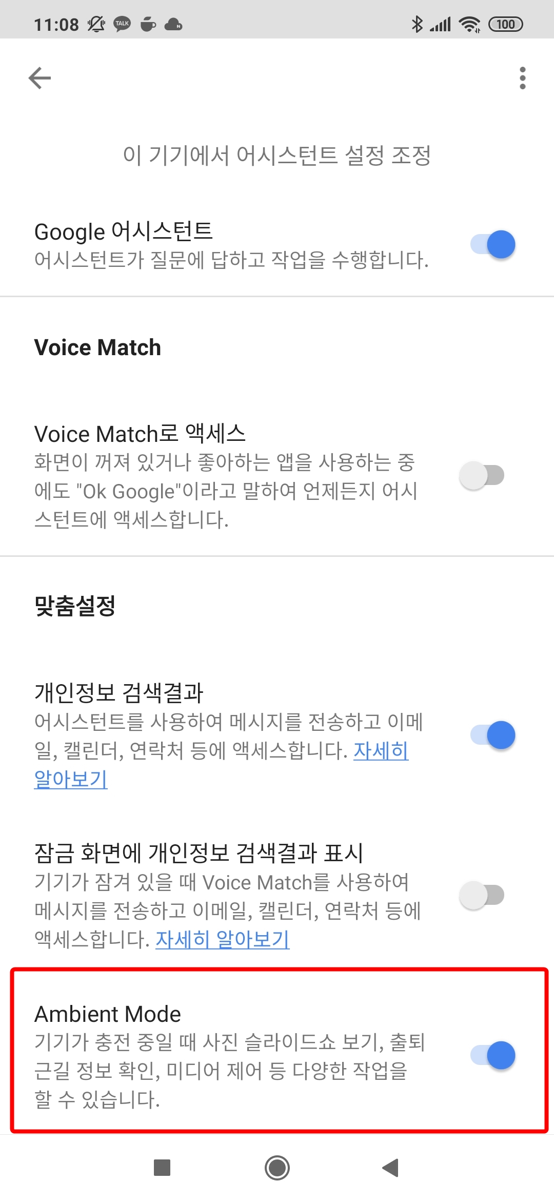 우하단 더보기 → 설정 → Google 어시스턴트 → 상단 어시스턴트탭 확인 → 휴대전화 → Ambient Mode 활성/비활성
