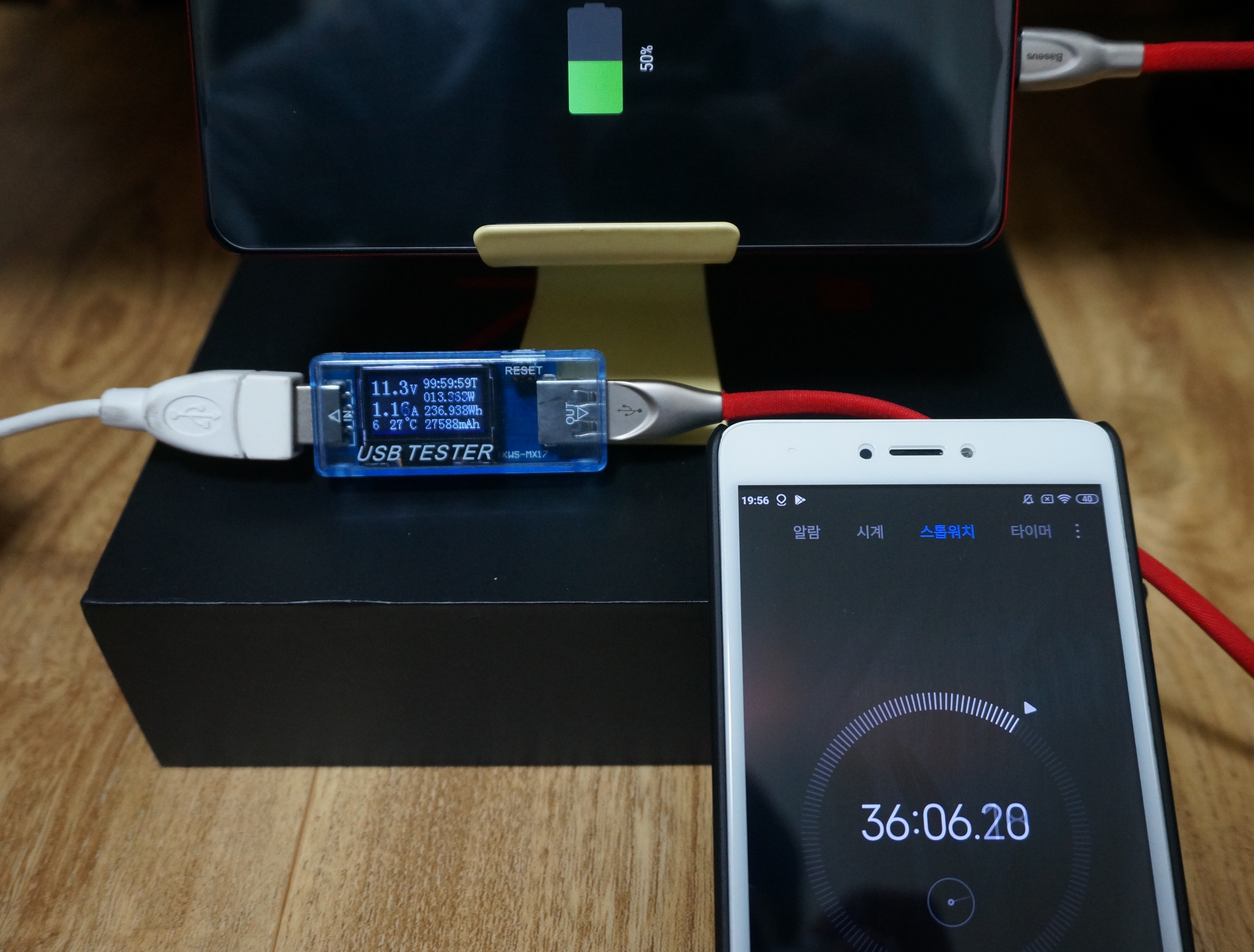 0%에서 충전 시작하여 50% 충전하는데 36분 소요