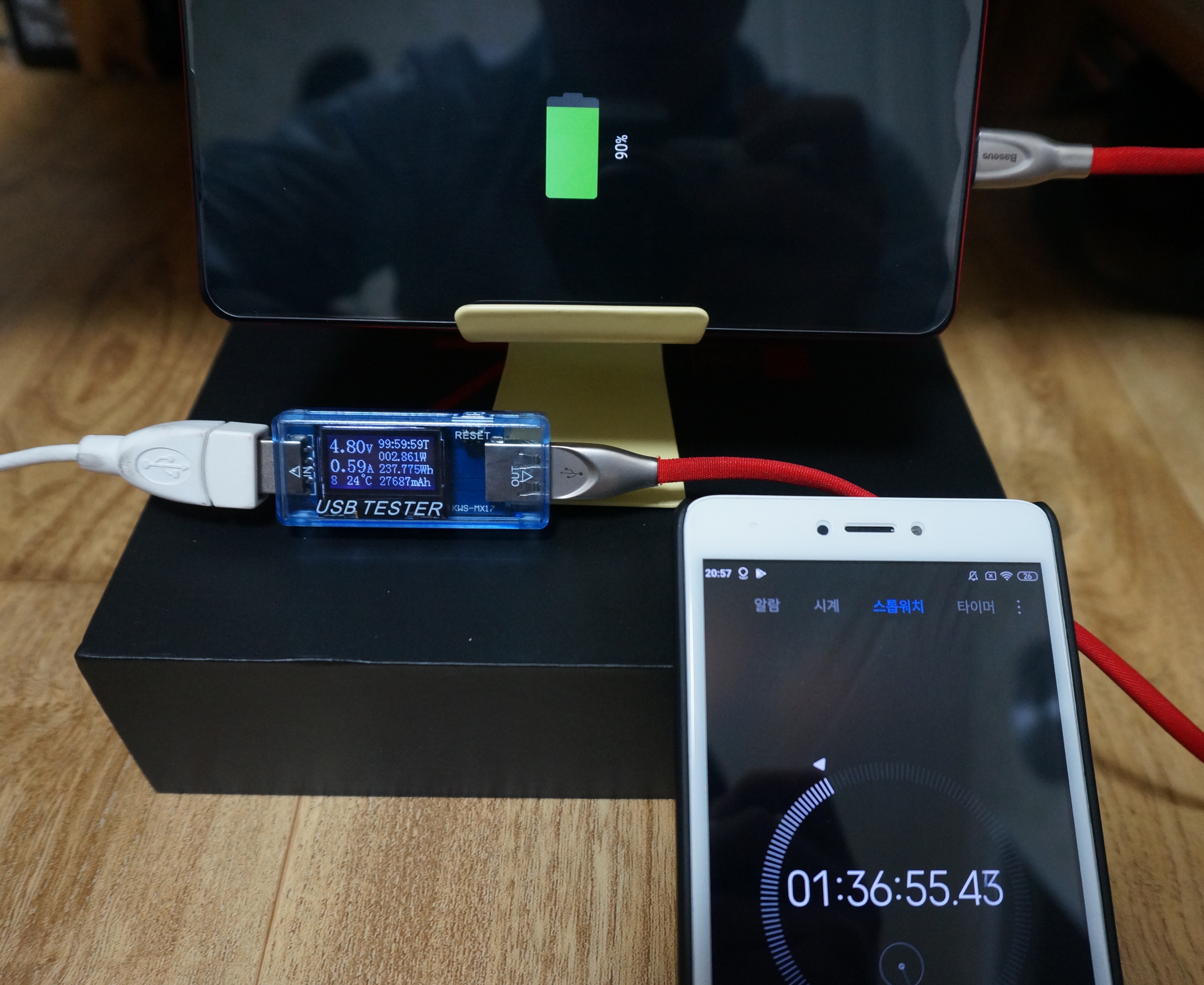 0%에서 충전 시작하여 90% 충전하는데 1시간 36분 소요
