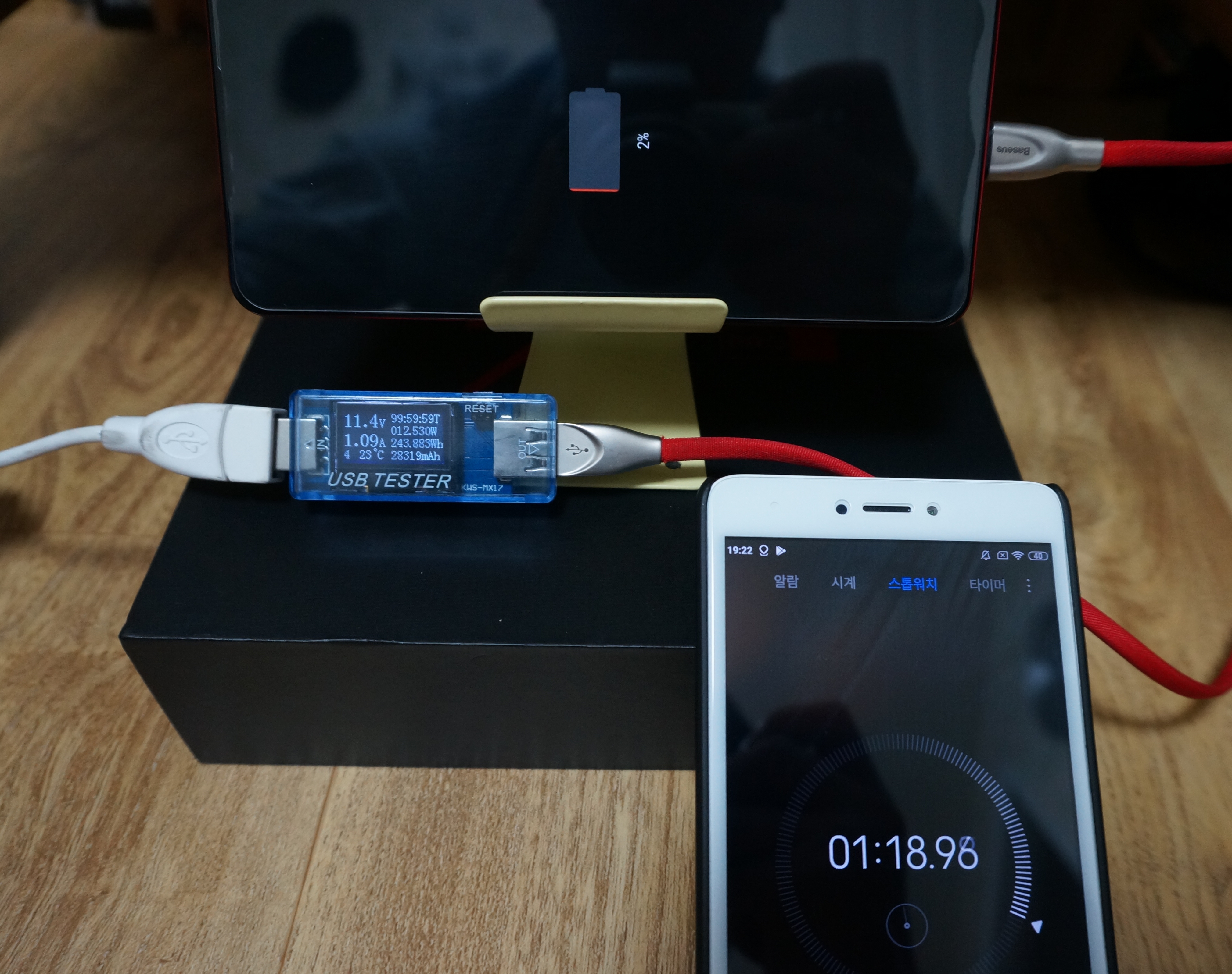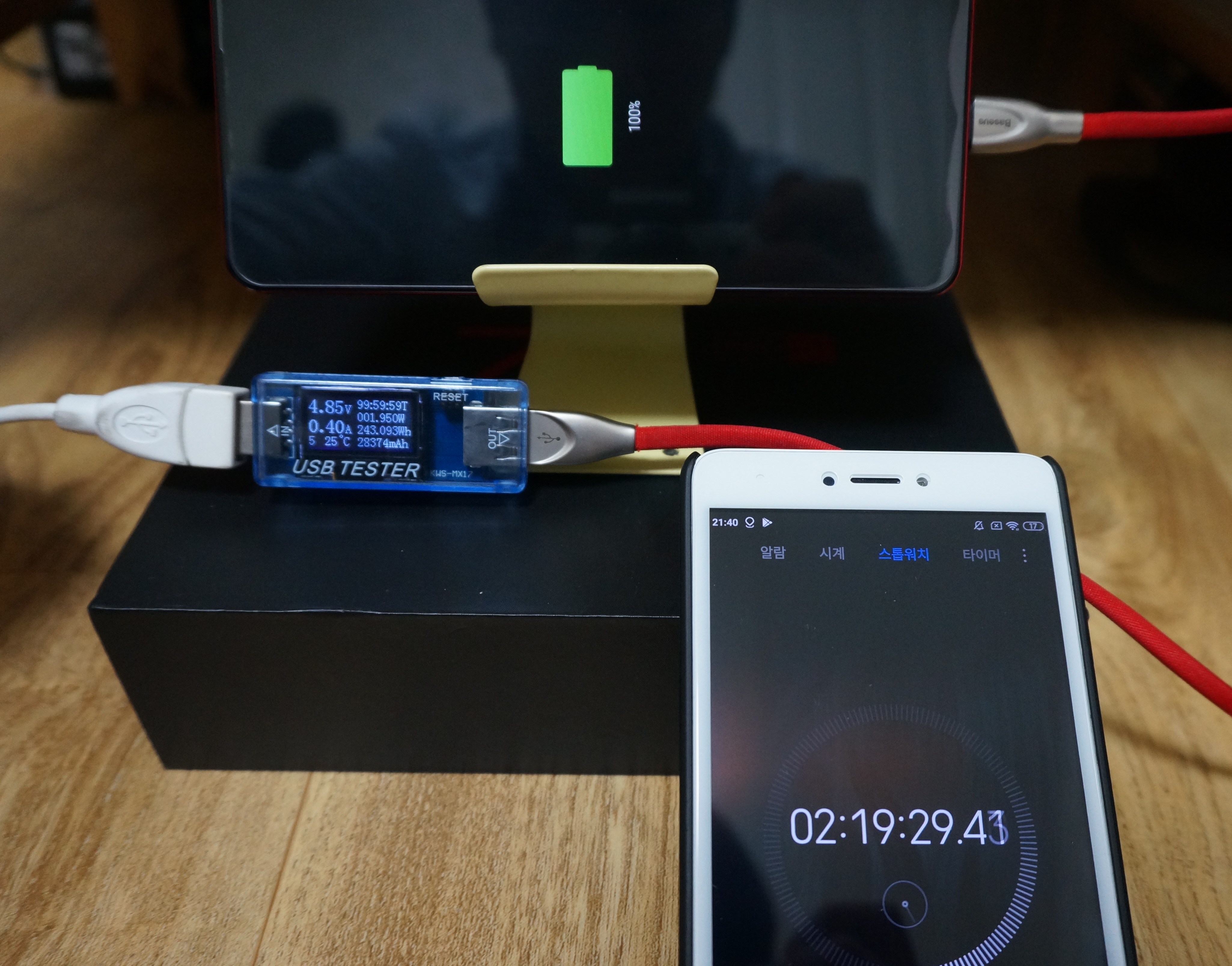 0%에서 충전 시작하여 100% 충전하는데 2시간 19분 소요