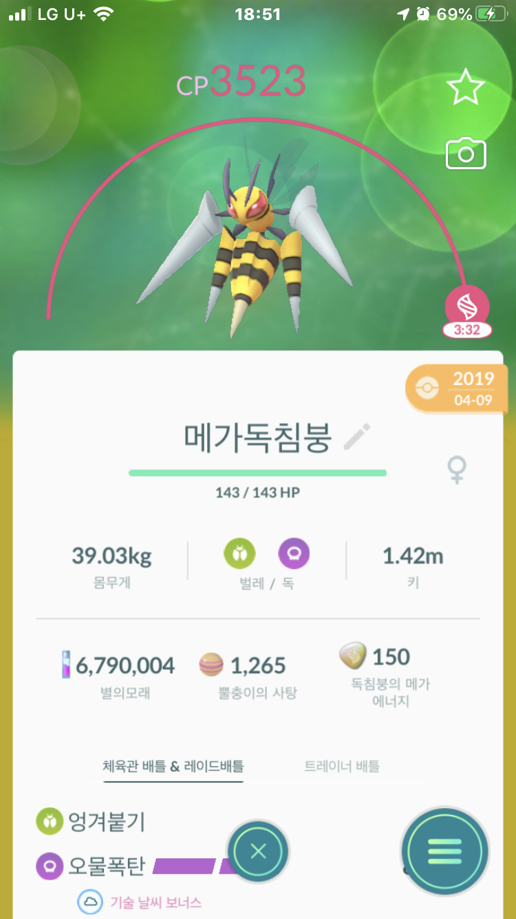 독침붕 + 독침붕의 메가에너지 100 진화 *4시간 / 이후 메가에너지 20 진화