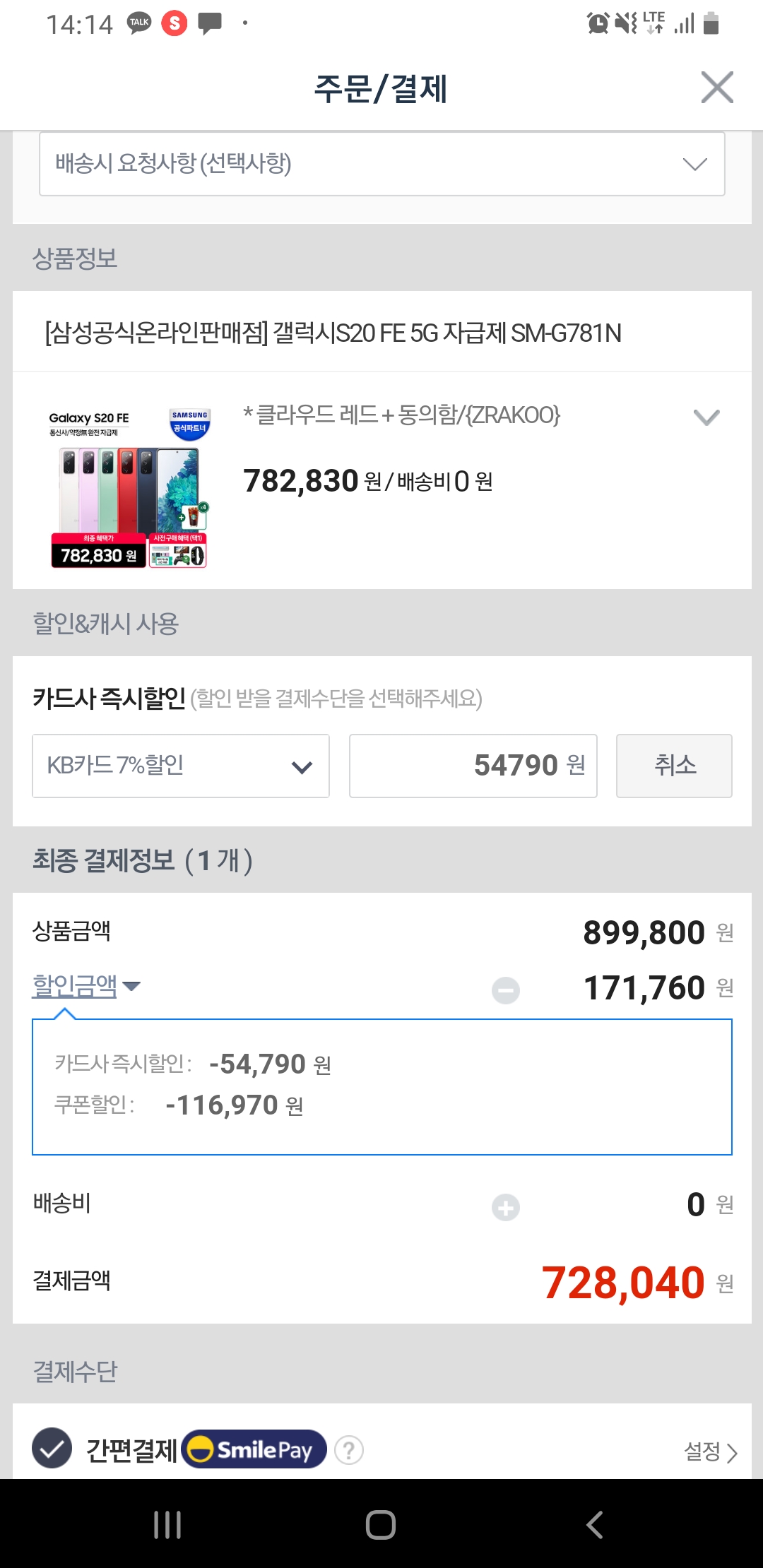 삼성 '갤럭시S20FE' 결국 4번째 다시 주문! 쿠폰, 할인카드 변경~