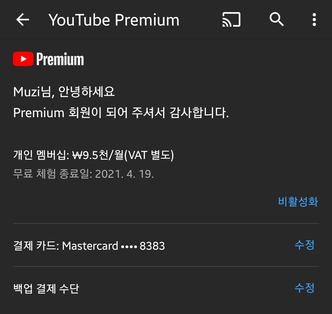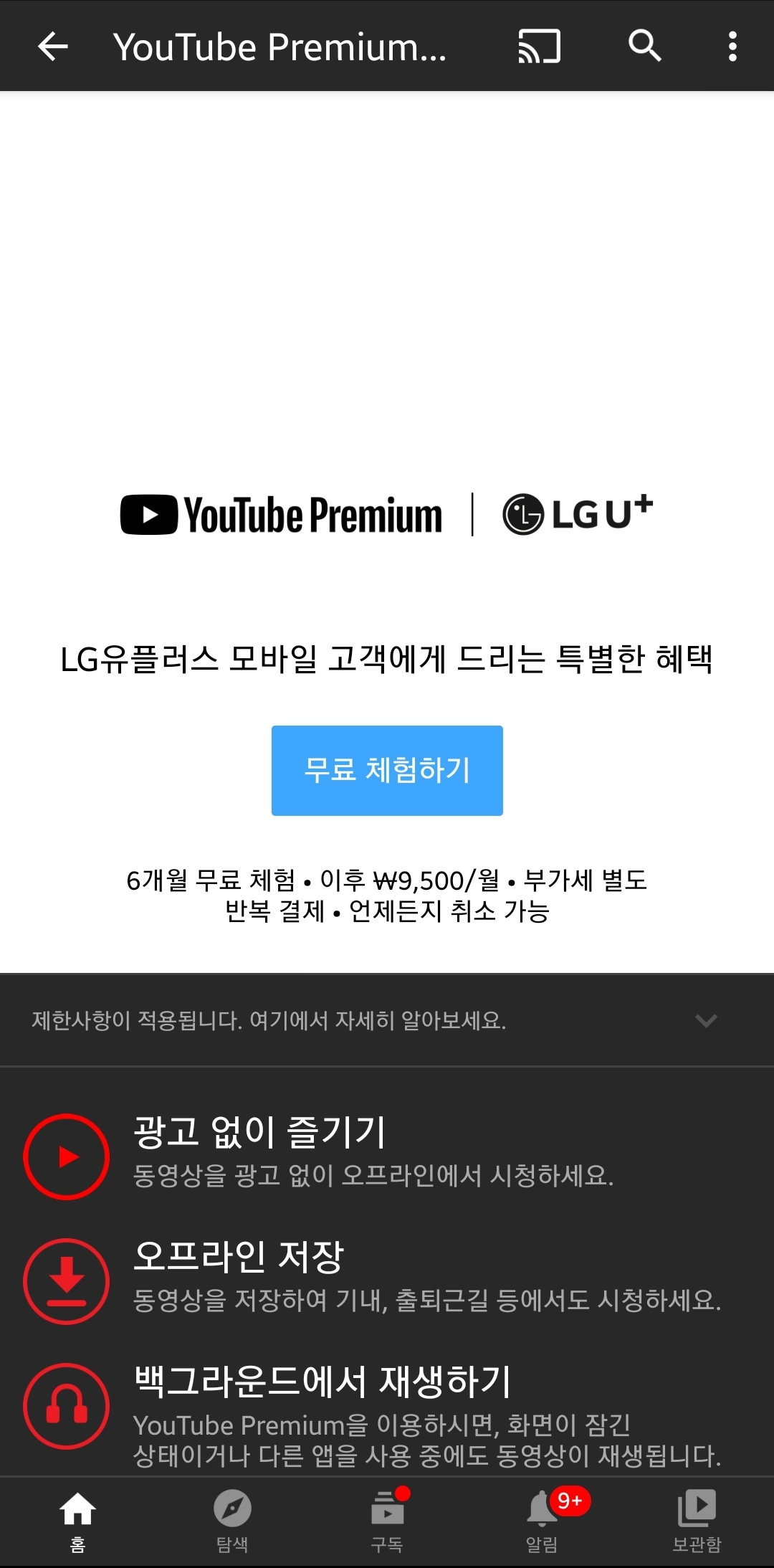 참고로 유튜브 프리미엄 멤버십은 한달에 9,500원(부가세별도)입니다.