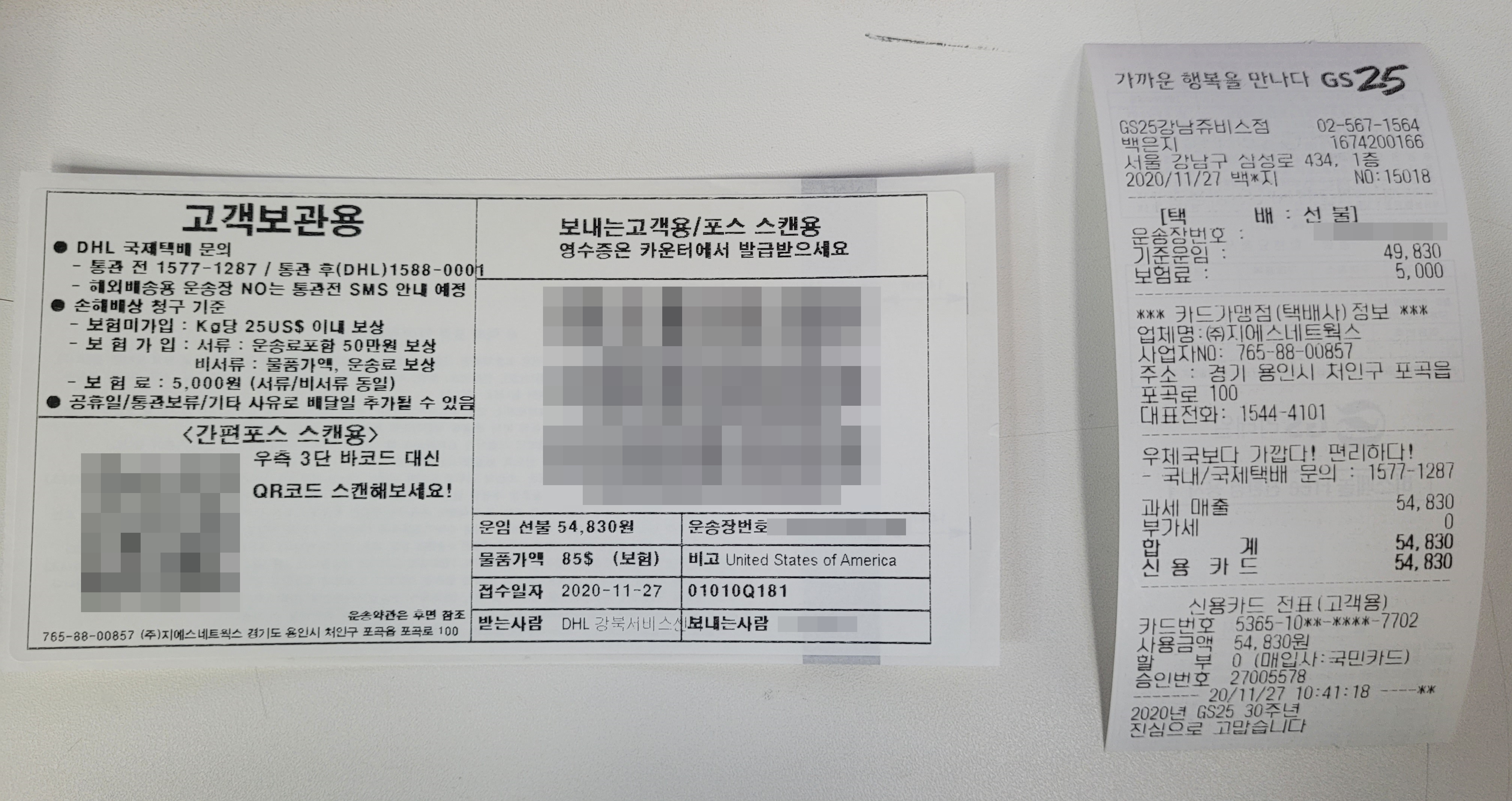 편의점택배(GS)로 보내기로 하고, 인터넷으로 국제택배(DHL) 예약 후 송장 출력, 접수, 결제 끝.
