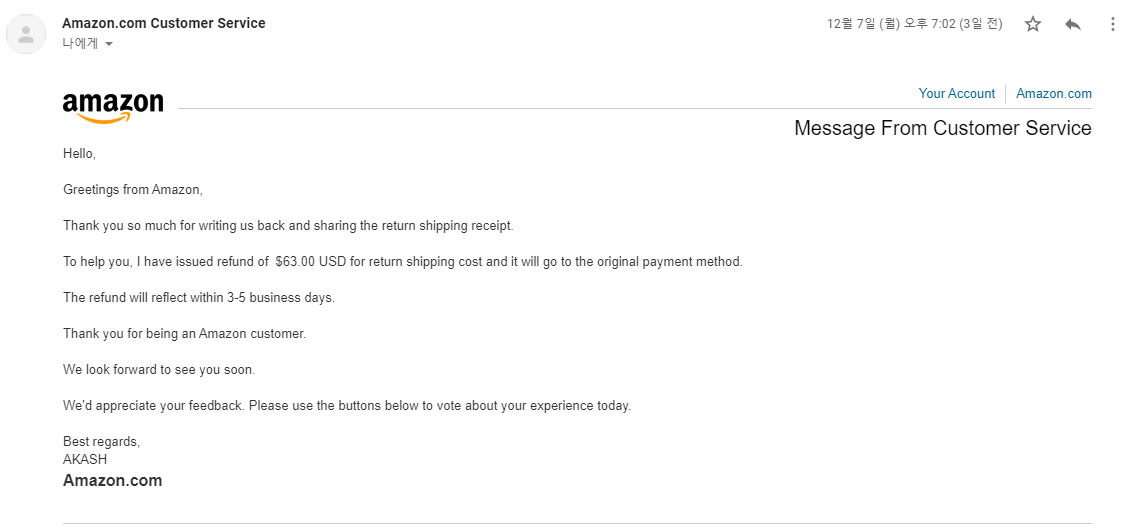 흠... 배송비가 얼마가 나올지도 모르는데 아마존 고객센터는 걱정하지 말고 보내랍니다 ㅡㅡㅋ