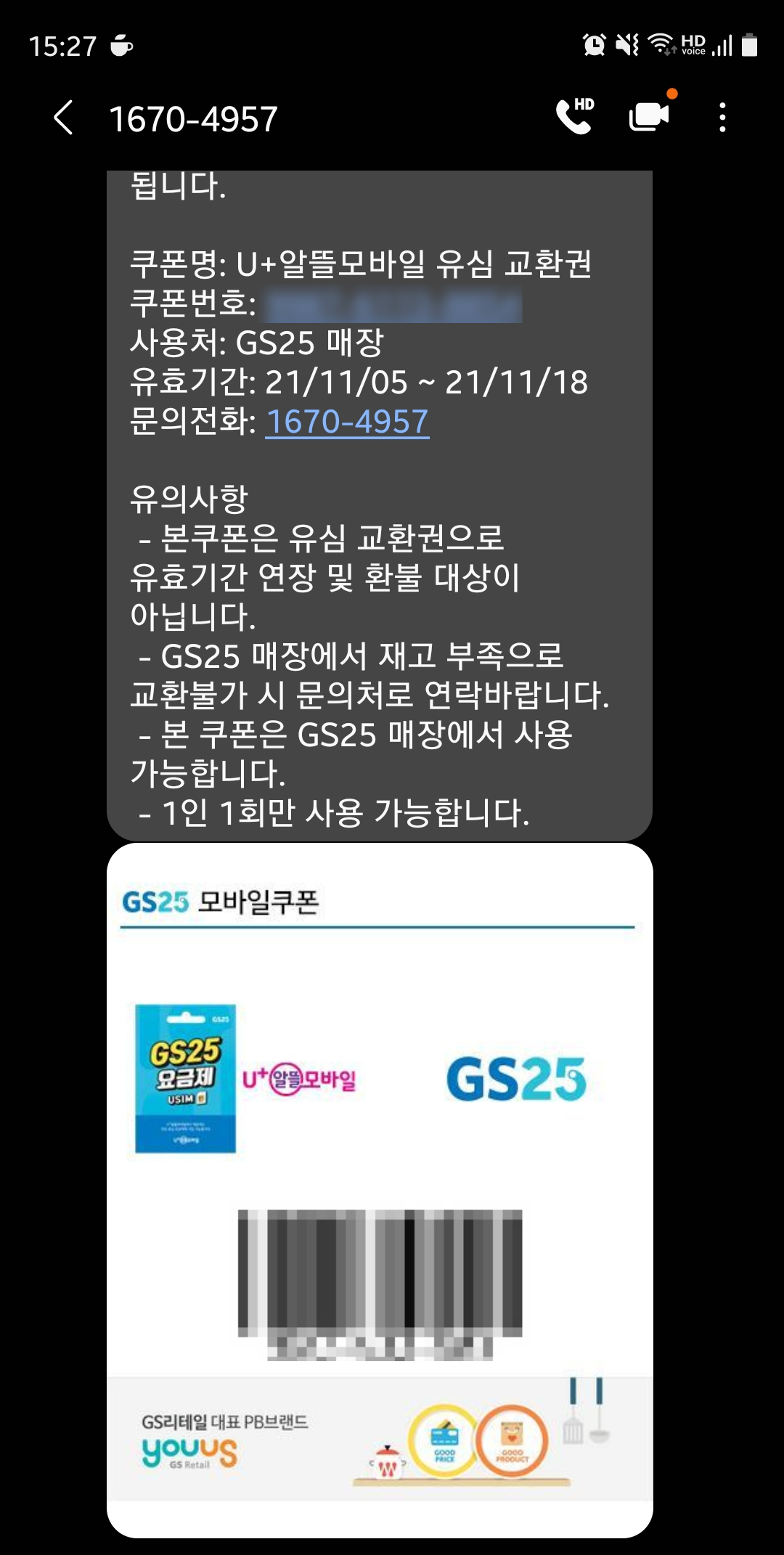 유심칩 구매 → GS25 바로픽업 → 4,400원 결제 → 문자로 교환권 도착 → 재고 확인 후 GS25 편의점에서 교환