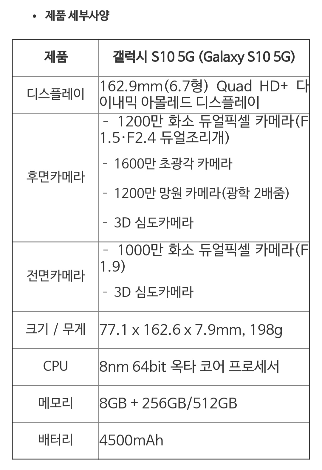 이번에 출시되는 갤럭시 S10 5G는 몰입도 높은 6.7형 ‘인피니티-O 디스플레이’와 전면 듀얼 카메라와 후면 쿼드 카메라까지 총 6개의 카메라를 탑재했다. 특히 후면에는 삼성전자 최초로 적외선 기술을 활용한 ‘3D 심도 카메라’를 적용해 실시간으로 영상에 보케 효과를 주는 ‘라이브 포커스 동영상’과 AR 기반의 간편 측정 기능을 제공한다. 이외에도 8GB 램, 4500mAh 대용량 배터리, 25W 급속 충전을 지원한다.