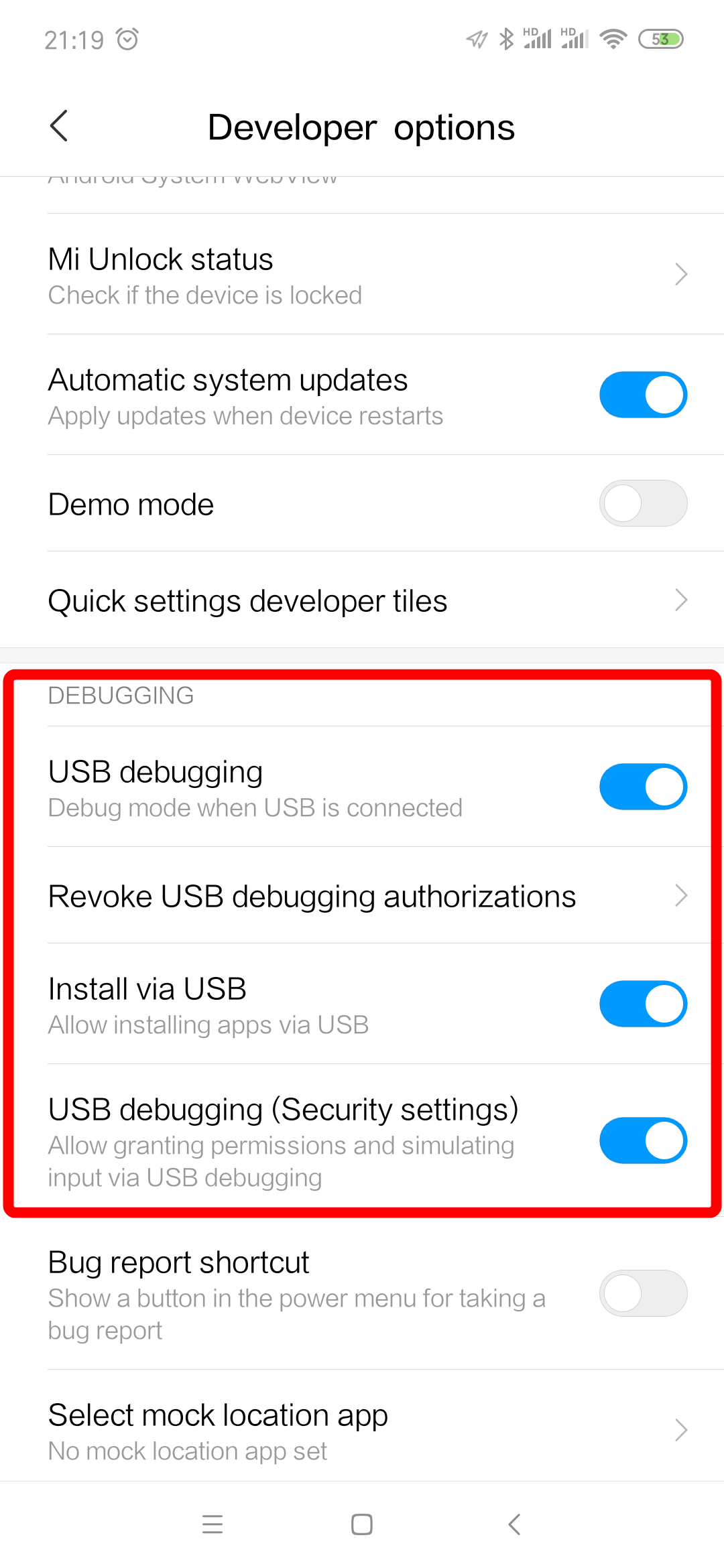 Install via USB 혹은 USB debugging (Security settings)을 활성화시켜주면 로케일 작업이 진행됩니다.