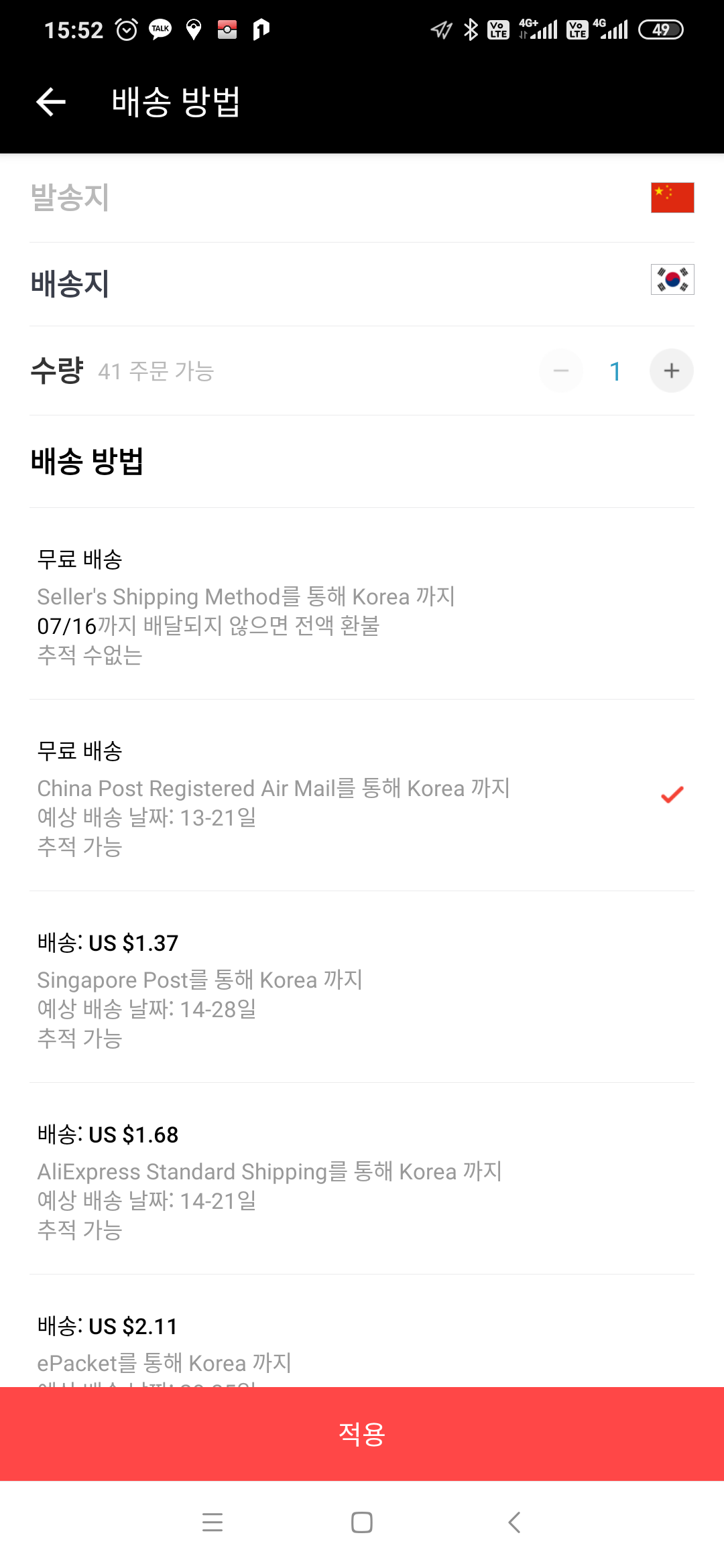 쿠폰 적용하고, 배송 방법을 China Post Registered Air Mail (예상 배송 날짜: 13~21일)로 변경