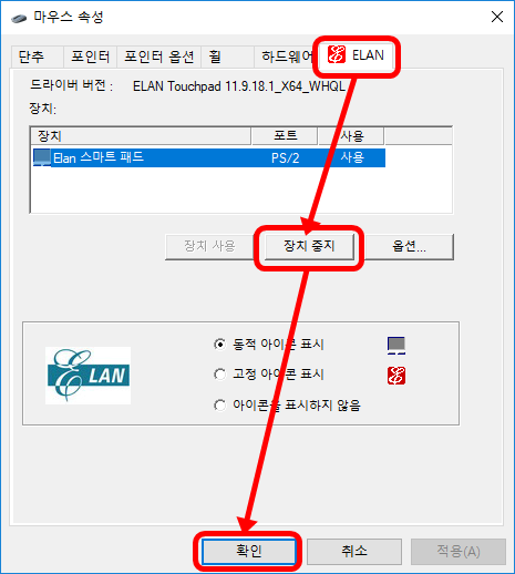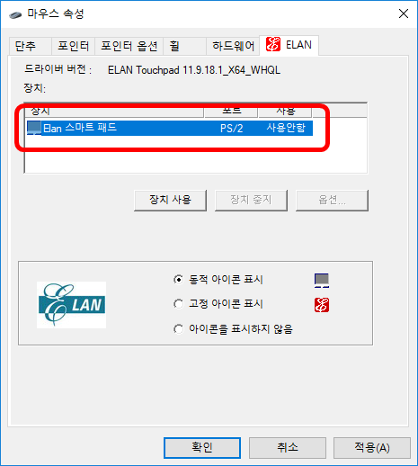 터치패드 유틸 확인(ELAN Pointing Device) > 아이콘 오른쪽 마우스 > Touch-Pad 속성